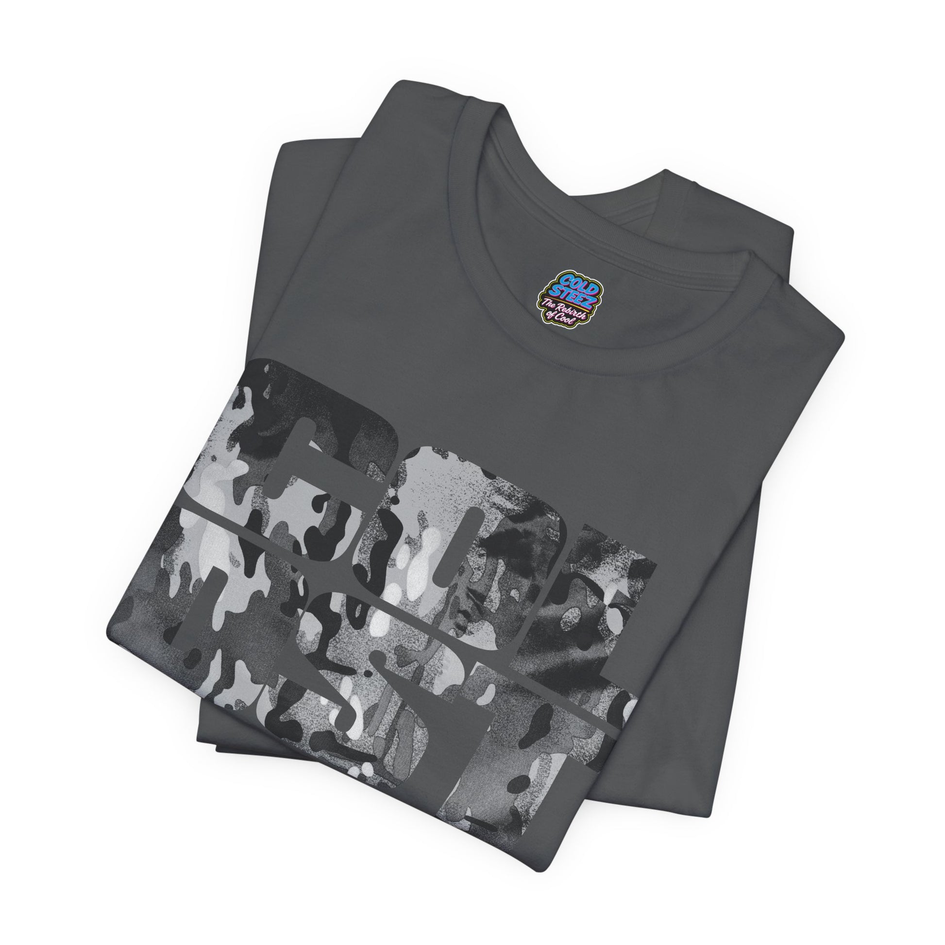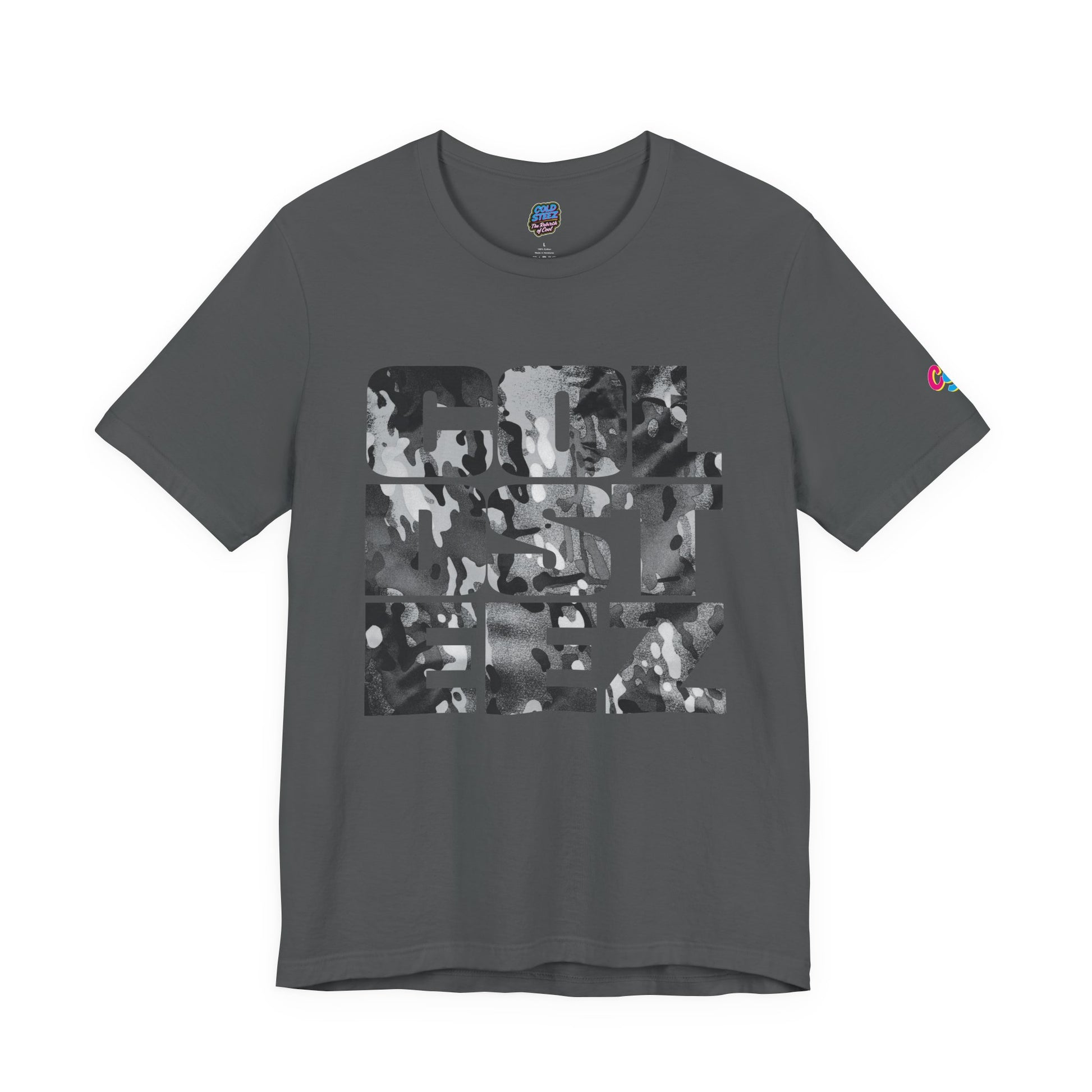 ColdSteez (CS003) “Arctic Camo Block" Tee is built for people who like their statement pieces loud in shape, quiet in attitude. The logo lands in stacked, heavyweight block letters, packed with Arctic camo in icy blues and deep ink tones. It’s clean, cold, and properly wearable, like a graffiti tag that learned manners but kept the threat. Available in sizes XS - XL, Black, Asphalt and White.